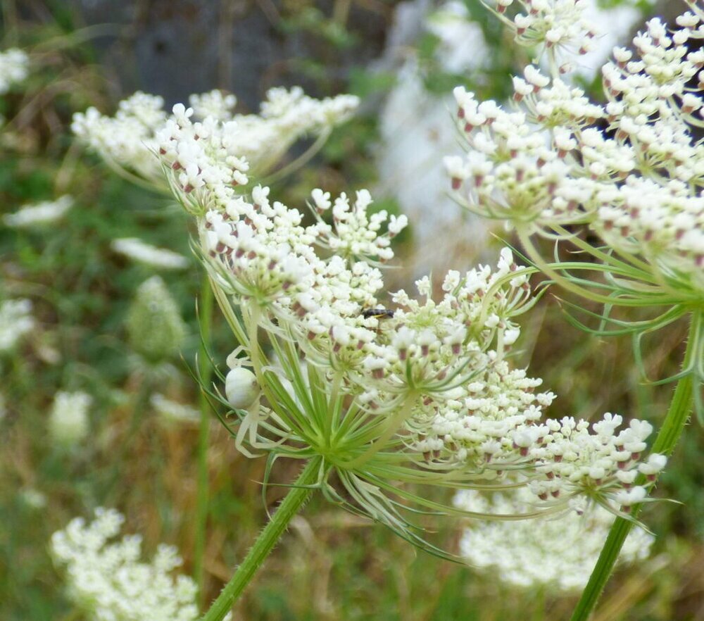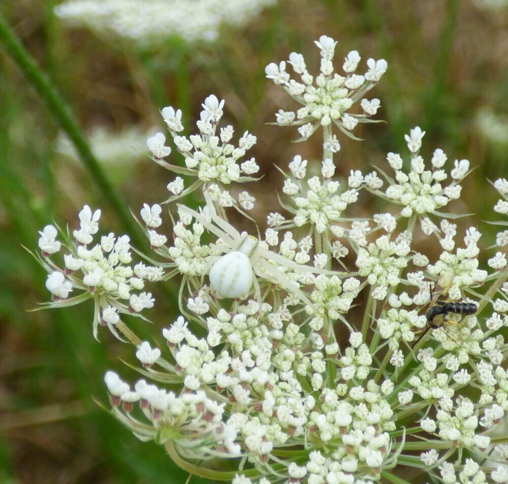 Traurig, vertrocknet, braun, schon fast tot, diese Worte fallen einem ein, wenn man sich die Wilde Ecke anschaut. Nur die Distel, Wegwarte, Malve, Ringelblume, Jakobskreuzkraut und die wilde Möhre bieten den Insekten Futter. Bei so wenig Futter gibt es auch weniger Insekten. Die großen Wespenspinnen habe ich in diesem Jahr noch nicht gesehen. Dafür aber viele Meister der Tarnung. Die Krabbenspinne ist ein Lauerjäger. Sie spinnen keine Netze, sondern warten geduldig in den Blüten auf ihre Beute. Dabei passt die Spinne ihre Farbe dem Untergrund an. Die Farbvarianten reichen von blütenweiß mit roten Streifen bis blassgrün oder bräunlich, leuchtend gelb bis smaragdgrün, gefleckt, längsgestreift, gelb bis orange. Dieses Farbspiel und die Körperform lässt die Spinne optisch mit dem Untergrund verschmelzen. Dazu kommt noch, dass Krabbenspinnen das UV Licht reflektieren können. Für Bienen, Wespen und Fliegen ist sehr anziehend. So erzielt die Spinne einen häufigeren Anflug ihrer Blüte. Sobald ein Beutetier auf die von einer Krabbenspinne besetzte Blüte fliegt, wird die Spinne es mit den beiden vorderen Beinpaaren ergreifen. Ist es eine Biene oder Wespe, wird das Beutetier so gegriffen, dass der Stachel die Spinne nicht erwischen kann. Ein Biss in den Nacken tötet schnell. Das Gift der Krabbenspinnen ist sehr wirkungsvoll, jedoch können die Spinnen uns Menschen nicht gefährlich werden. Unsere Haut ist zu dick, als dass die Kiefer der Spinne sie durchbeißen könnten. Weil Krabbenspinnen keine Netze bauen, haben sie ein feines Gespür für Luftdruck und Schall, mit dem sie ihre Beute orten können. Dazu sind sie mit einem sehr guten Sehsinn ausgestattet. Sie erkennen ihre Beute aus 10 bis 20 cm Entfernung. Da kann man nur froh sein, kein Insekt zu sein. Auch wenn mir Spinnen immer noch einen Schauer über den Rücken laufen lassen, faszinieren mich diese Tiere. Die Trockenheit ist für alle Tiere ein Problem. Es gibt wenig Futter und von Wasser brauchen wir nicht zu sprechen. Die Vögel der wilden Ecke findet man jetzt in der Brombeerhecke. Die reifen Früchte locken Wanzen, Wespen und Fliegen an. Die Mäuse gönnen sich die heruntergefallenen Früchte. Mäuse gibt es dieses Jahr viele. Turmfalke, Bussard, Graureiher, Storch und Fuchs machen Jagt auf die kleinen Nager. Auch wenn es auf den ersten Blick nicht so ausschaut, die wilde Ecke lebt!
