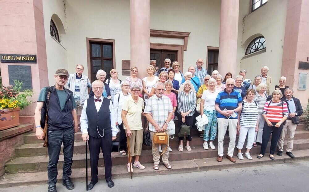 Gekleidet im Biedermeier-Stil der 1850er Jahre, machte den Besuch der ehrenamtliche Experimentator Eberhard Theophel von der Justus Liebig-Gesellschaft möglich. Reiseleiter Dr. Heinz Bengart und die Gruppe staunten im Experimentalvortrag über zahlreiche laute, farbige, verblüffende Experimente. Aber auch Liebigs praktische Erfindungen wie Brühwürfel und Kunstdünger überraschten viele.
