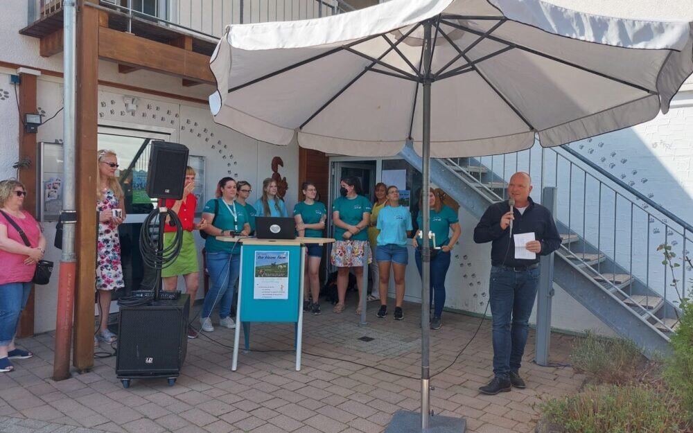 gespendet hat. Auf dem neben dem Tierheim gelegenen Grundstück sollen u. a. Unterkünfte für die Unterbringung sogenannter Nutztiere geschaffen werden. Des Weiteren dankte Paparone den Mitarbeiterinnen und Mitarbeitern sowie den ehrenamtlichen Helferinnen und Helfern, die das Tierheimgelände auf Vordermann gebracht, Kuchen gebacken und Spenden gesammelt haben. Dank wurde auch an den Spendern der Preise für die Tombola ausgesprochen. Bereits am frühen Nachmittag waren die Lose für die Tombola ausverkauft.