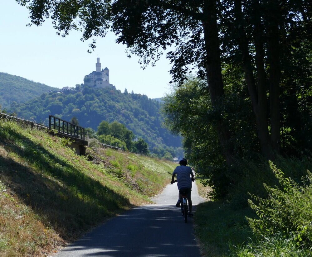 war , sind wir jetzt weiter von Lahnstein am Rheinradweg in Richtung St.Goarshausen gefahren. Es gibt einen sehr schönen Parkplatz in Lahnstein direkt am Rhein. Man kann den ganzen Tag für 2.00 Euro parken. Dort haben wir dann die Fahrräder vom Auto abgeladen und es konnte losgehen. Der Weg geht immer direkt am Rhein entlang und es gibt zumindest bis Kamp-Bornhofen keine Steigung. Der nächste Ort ist Braubach und die Marksburg ist wunderschön vom Radweg aus zu sehen. Immer mal wieder Ausblicke auf den Rhein mit sehr niedrigem Wasserstand. Vorbei am nächsten Ort Osterspai nach Filsen. Es war nun Mittagszeit und ein schöner Gasthof mit einladendem Namen ” Rheinblick” lud uns zum Stop ein. Dann ging es weiter und wir kamen zur Fähre nach Boppard auf der anderen Seite. Weiter nach Kamp-Bornhofen und von dort wieder zurück nach Lahnstein.