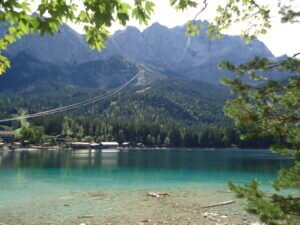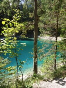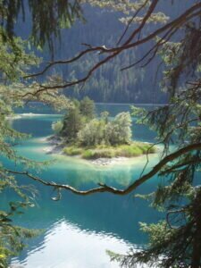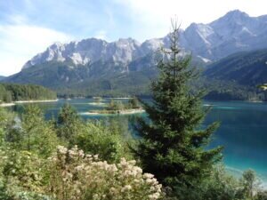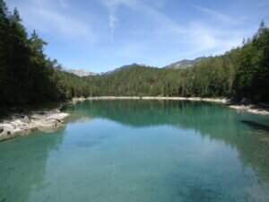 Wie kaum ein anderer See hat der Eibsee eine intensive Färbung des Wassers zwischen grün, türkis, blau und dunkelblau. Richtet man den Blick in Richtung Zugspitzgipfel, glänzt in der Sonne das Tragseil der Zugspitzseilbahn und die weltweit höchste Seilbahnstütze mit 127 m ragt aus dem Wald hervor.