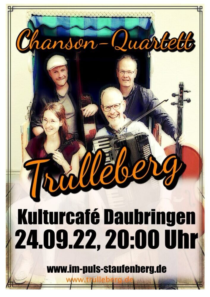 Am Samstag, den 24. September, präsentieren die vier Musiker*innen des Marburger Chanson-Quartetts Trulleberg ein breit gefächertes Programm mit bekannten und weniger bekannten Melodien und verbinden in einzigartiger Weise stilistische Gegensätze aus Chansons, Rock- und Pop, Liedermacher, Musical, Folk und Filmmusik bis hin zur neuen deutschen Welle der 80er Jahre.