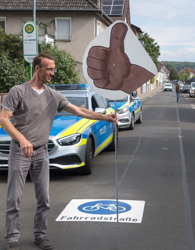 „Daumen runter!“ wurde u.a. am Schützenweg gezeigt, weil die für diese Strecke vor 24 Monaten beschlossene Fahrradstraße immer noch nicht realisiert wurde. Auch am Rinnerborn gibt es außer guten Worten bislang keine Fortschritte. Und ebenfalls die Situation am Schwimmbadgässchen ist ungenügend. Auf den Kreisverkehr an der gefährlichen Kreuzung Schützenweg/Bismarckstraße wird weiter dringlich gewartet.