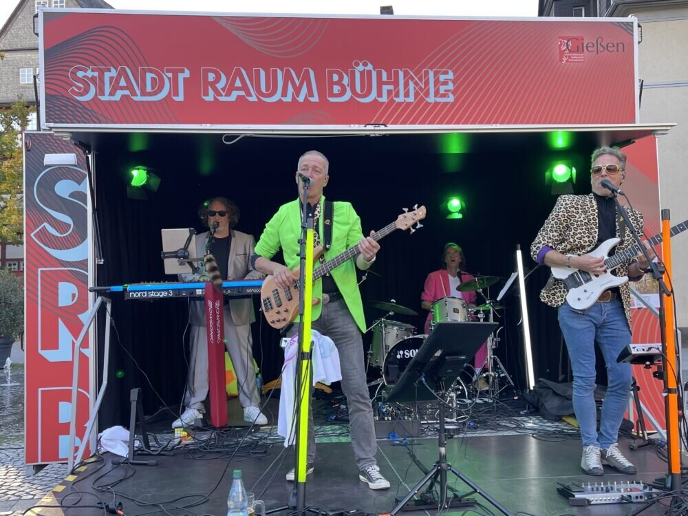 Die Besucher der Gießener Innenstadt waren sichtlich überrascht, als am Mittwochnachmittag auf dem Kirchplatz plötzlich Musik aus den 80er Jahren erklang. Die Wirtschaftsförderung der Stadt Gießen hatte die Gruppe Back 2 the 80s eingeladen, um im Rahmen des Projektes „Stadt Raum Bühne“ für Abwechslung zu sorgen. Hierzu wurde extra eine mobile Bühne angeschafft, die relativ schnell an unterschiedlichsten Orten in der Gießener Innenstadt aufgebaut werden kann. Der Technik-Partner, die Firma AEM, stellte eine komplette Backline zur Verfügung, zu der nur noch die Instrumente hinzugefügt werden mussten. In poppigen Anzügen boten die Musiker von Back 2 the 80s ein zweistündiges Programm mit einem Feuerwerk an Songs der 80er Jahre. Neben Extrabreit, Falco und Spliff aus der Neuen Deutschen Welle erklangen Hits von ZZ Top, Bryan Adams und David Bowie. Auch die Fans des New Wave kamen bei Liedern von Depeche Mode und den Romantics auf ihre Kosten. Besonderes Highlight war ein Quiz zu Titelmelodien von berühmten Filmen und Fernsehsendungen aus der Dallas und Denver-Zeit bei welchem ein echter Rubiks Cube Zauberwürfel gewonnen werden konnte. Auf dem Kirchplatz wurde bei herrlichem Herbstwetter bis in den frühen Abend ausgiebig mitgeklatscht und getanzt und dir Ära von Schulterpolstern und Kassettenrekordern zurückgeholt.