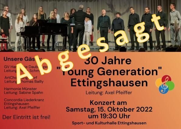 Absage Jubiläumskonzert der „Young Generation“ Ettingshausen Von Anja Gottwalz - 12. Oktober 2022 355 Zum Bedauern aller Akteure muss das Konzert am Samstag leider krankheitsbedingt abgesagt werden! Sobald ein neuer Termin feststeht, wird dieser bekannt gegeben.