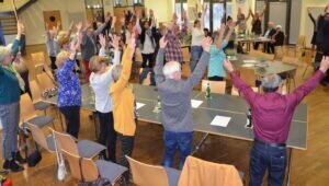 Ortsvorsteher Daniel Jung wünschte sich Frauengymnastik mal „life“ zu erleben. Der Wunsch wurde ihm erfüllt und Übungsleiterin Anke Roese leitete alle Gäste im Saal an. Fünf Minuten Gymnastik überzeugten auch die Männer vom gesundheitlichen Wert dieser Übungen und sorgten für Heiterkeit im Saal.