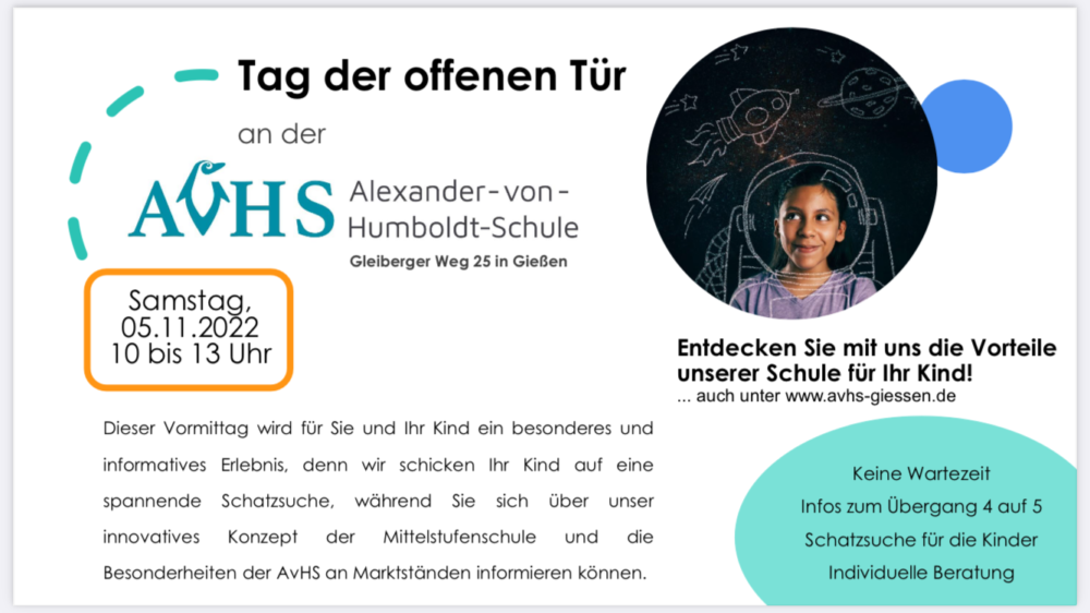 Nähere Informationen zur Schule und zum Tag der offenen Tür erhalten Sie auf der Homepage der Schule unter www.avhs-giessen.de.