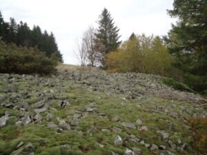 Wieder einen Tag später ging es vom Parkplatz Schornhecke am Rande des Ulstertales bei Wüstensachsen-Ehrenberg den gemächlichen weichen Wiesenweg hinauf zum Heidelstein. Dort kommt man zunächst an der Gedenkstätte des Rhönklubs für gefallene und verdiente Aktivisten desselben an. Den Abstecher zum 218 m hohen Sendemast Heidelstein der Telekom (Richtfunk, TV und UKW-Hörfunk) auf Höhe 926 m ersparen wir uns. Ab hier befinden wir uns im bayerischen Teil der Rhön. Immer den Blick auf die “Lange Rhön” im Norden wandern wir kaum merkbar abwärts zum Basaltsee bei Oberelsbach. Dort wurden bis in die 50-er-Jahre des letzten Jahrhunderts bis zu 12 m lange Basaltsäulen abgebaut, die hauptsächlich bei Deichbauten in den Niederlanden und auch noch nach der Sturmflut 1962 in Norddeutschland Verwendung fanden.