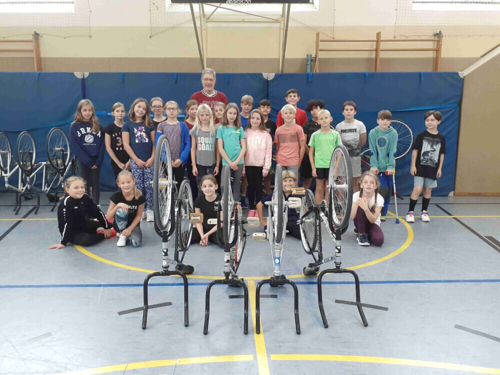 Die Schüler wurden im Vorfeld medial auf die Randsportart “Radball” von Herrn Fey vorbereitet. Dann ging es zum praktischen Teil: Alle Kinder konnten die Unterschiede zwischen einer Radballmaschine und einem Straßenrad kennen lernen. Erste Fahrversuche auf den skurril anmutenden Vehikeln waren zunächst holprig, was Herr Fey am eigenen Leib erfahren musste. Aber bereits nach kurzer Zeit war man schon viel sicherer, so dass verschiedene Fahrübungen und sogar Wettrennen durchgeführt werden konnten. Selbst (Vor-)Übungen zum Schießen wurden gemeistert.