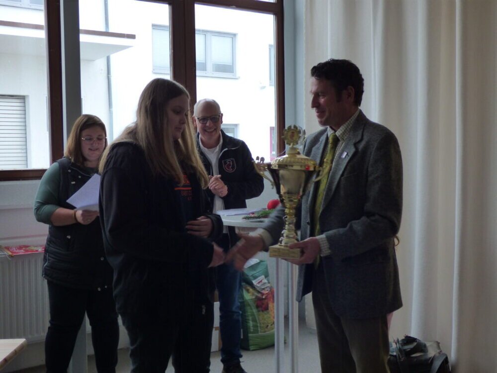 Am 19. und 20. November trafen sich die Züchter des Kleintierzüchterverein Heuchelheim e.V. zu ihrer Lokalschau in der Halle einer ehemaligen Schreinerei. So konnten die Auflagen, die wegen der Vogelgrippe gegeben sind, gut eingehalten werden. In den Käfigen wurden zwei fränkische Landgänse, 18 Hühner, 58 Zwerghühner und 82 Tauben der verschiedensten Rassen gezeigt. Es war eine kleine, aber vielfältig und hochwertige Rasse-Geflügelausstellung auf die Füße gestellt worden. Den Eingang zeigten der Hahn und die Gans vom Faschingswagen. Der Kleintierzüchterverein Heuchelheim e.V. hat sich als Ziel den Erhalt alter Rasse-Geflügelarten gesetzt. Man spricht hier weniger von Legeleistung und Fleischqualität. Hier geht es um Rassemerkmale wie Gefieder und Körperhaltung. Natürlich werden die Eier und das Fleisch auch genutzt, aber das ist nicht das wichtige bei dieser Art der Geflügelzucht. Den Züchtern ist viel mehr am Wohl der Tiere gelegen, was man durchaus auch bei den Tieren sehen konnte. Ein Huhn kuschelt wohl nur mit seinem Besitzer, wenn er es auch gut behandelt. Ein gutes Gefieder hat nur der gesunde Vogel. Nicht nur die Tiere sollten sich wohlfühlen. Für die Besucher gab es Kaffee und selbstgebackenen Kuchen sowie Würstchen und kalte Getränke. Um 14 Uhr wurden die Preisträger genannt. Der Leistungspreis, den sogenannten Bürgermeisterpokal, konnte Vanessa Hanisch mit ihren Tauben der Rasse Kölner Tümmler in Weiß gewinnen. Sie erreichte, 571 Punkte. Natürlich wurde dieser Wanderpokal von Bürgermeister Lars Burkhard Steinz überreicht. Vereinsmeister der Hühner wurden mit 378 Punkten die Australorps in Schwarz von Harry Schmitt. Bei den Zwerghühnern konnte Werner Ehrmann mit seinen Deutschen Zwerg-Wyrandotten in Gelb, 374 Punkte erreichen. Die Zuchtgemeinschaft F&A Sauer konnte für ihre Tauben der Rasse Italienische Mövchen eisfarbig 380 Punkte einstreichen. Der Preis des Jugendzüchters ging wieder an Vanessa Hanisch. Mir haben die Gänse, der große schwarze Hahn der Australorps und das zutrauliche Kuschelhuhn der Rasse Deutsche Zwerg-Lachshühner am besten gefallen.