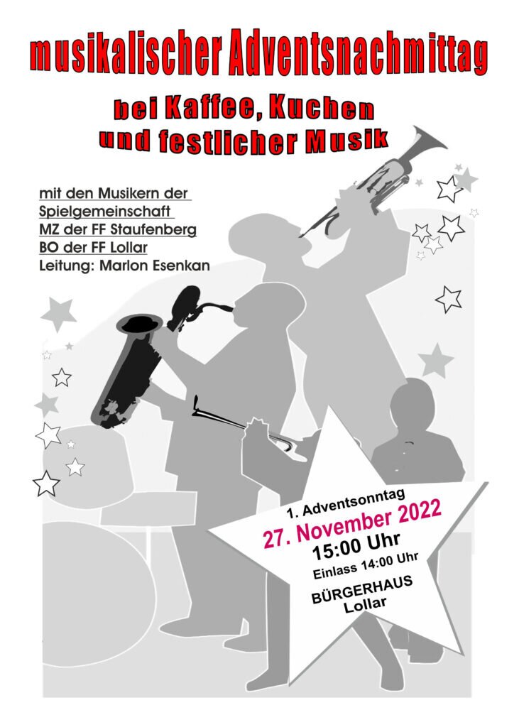 Der Förderverein des Jugendblasorchesters der Freiwilligen Feuerwehr Lollar e. V. lädt ganz herzlich zum musikalischer Adventsnachmittag am Sonntag, dem 27. November 2022 um 15.00 Uhr im Bürgerhaus der Stadt Lollar ein.