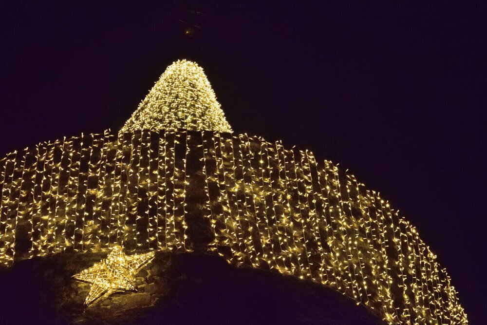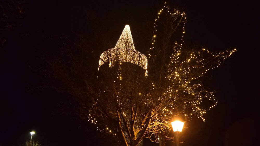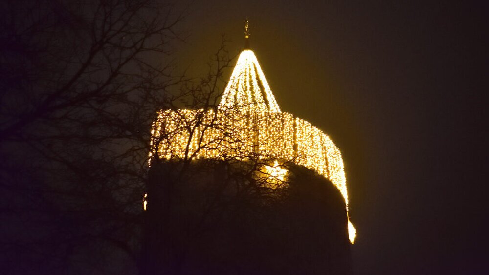 Der Grünberger Diebsturm ist wieder stimmungsvoll mit mehr als 100.ooo Lichtern beleuchtet. Seit zwei Jahren wurde am Dienstag nach Totensonntag die Weihnachtsbeleutung feierlich eingeschaltet. Die Turmspitze und Brüstungsrand haben in diesem Jahr ein neues ´Gewandt´ erhalten.