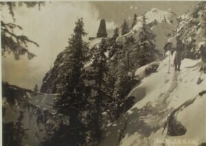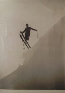 So zog man, wenn es dann richtig bergauf ging, die Steigfelle auf die Skier, damals noch echte Seehundfelle. Die langen Haare ermöglichten es, die Skier leicht nach vorne zu ziehen, verhinderten aber ein Zurückrutschen. Auf den viel begangenen Routen hatte man dann meistens auch das Glück, daß schon andere vorher eine Trasse “gespurt” hatten und man sich nicht durch tiefen Neuschnee quälen mußte.