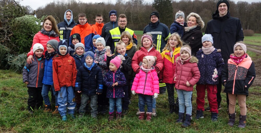 Zu Fuß ging es an den Ortsrand, wo die Jugendfeuerwehr die zuvor im Dorf eingesammelten Weihnachtsbäume schon abgeladen hatte.