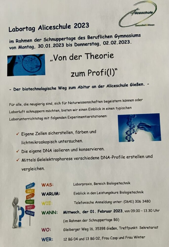 Vom 30.01.-02.02.2023 finden am Beruflichen Gymnasium der Aliceschule Gießen wieder die beliebten Schnuppertage statt.