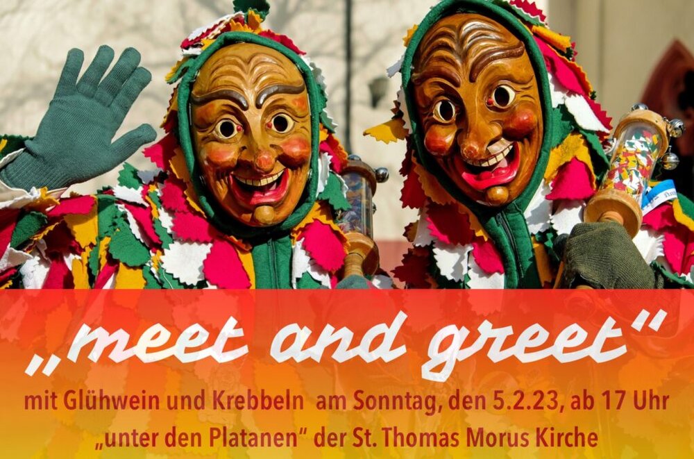 Am kommenden Sonntag, den 5.2.2023 lädt der Vorstand des Fördervereins, ab 17 Uhr zum gemeinsamen „Meet and Greet“ bei Glühwein und Krebbeln auf den Kirchplatz unter den Platanen der St. Thomas Morus Kirche, Grünberger Straße 80, in Gießen.