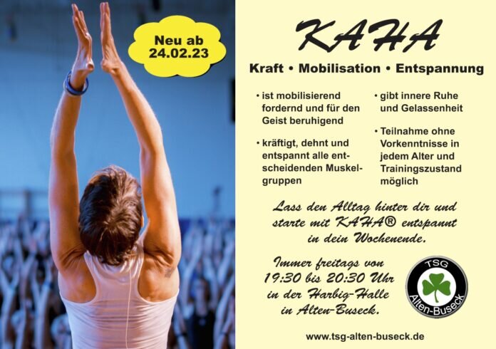 Bei der TSG Alten-Buseck gibt es ab dem 24. Februar in der Harbig-Halle – immer freitags von 19:30 Uhr bis 20:30 Uhr – ein neues Sportangebot: KAHA®. Die Übungen werden im Stand ausgeführt. Langsam und fließend geht eine Bewegung in die andere über, sodass immer genügend Zeit bleibt, diese kontrolliert auszuführen und einen sofortigen Effekt zu spüren – eine gesunde Balance zwischen Beweglichkeit und Stabilität des Körpers. KAHA® kräftigt, dehnt und entspannt entscheidende Muskelgruppen, führt zu Stressabbau und innerer Ruhe.