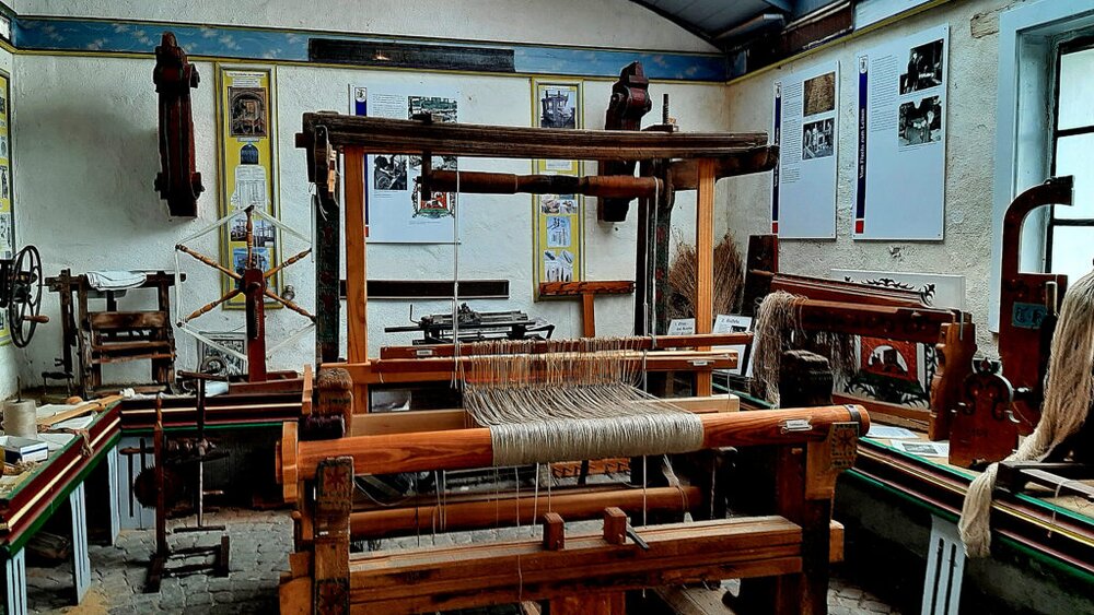 Der Webstuhl erinnert an die große Zeit der Grünberger Woll- und Leinenweber. Bis in die 60er Jahre gab es in Grünberg eine Vielzahl von Webereien, die zum einen Leinenstoffe, aber auch Wollstoffe produzierten. Der für die Leinenfaser notwendige Flachs wurde in dem Gebiet der Au, dem heutigen Reitplatz angebaut. Ebenso lieferten die Schafherden aus Grünberg oder dem Vogelsberg die notwendige Wolle. Die Weberei wurde im Winter auch als Heimarbeit in kleinen, privaten Webereien im Vogelsberg betrieben und die Stoffe und Garne nach Grünberg verkauft.