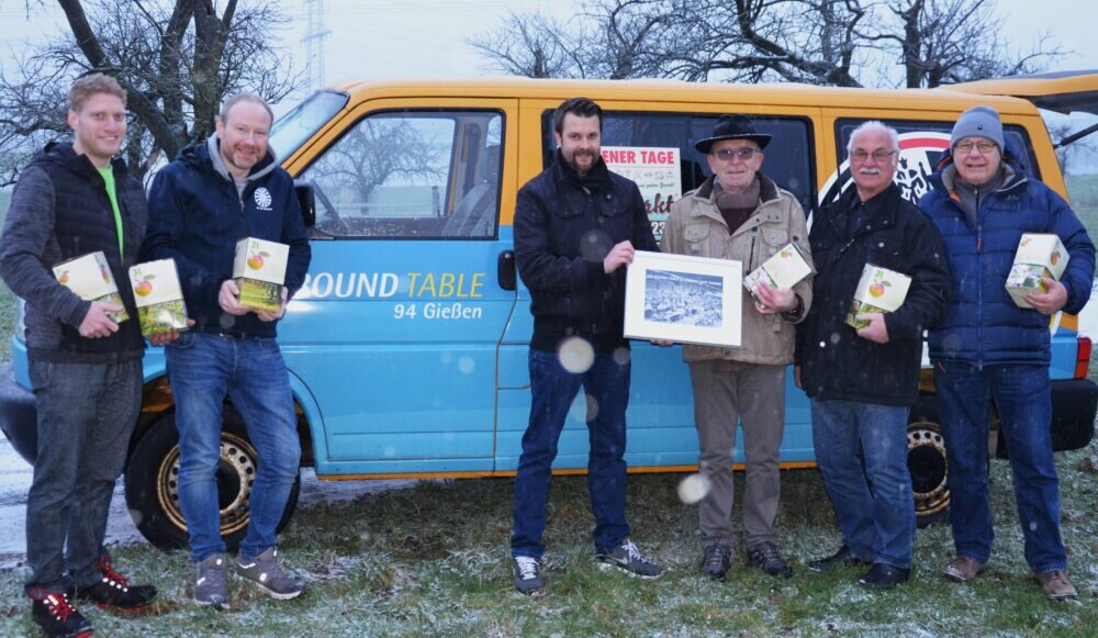 Pohlheim – Kürzlich besuchten Vertreter des „Round Table 94 Gießen“ (RT 94) den Bürgerverein Holzheim und überreichten dem Vorsitzenden des Bürgervereins Horst Biadala sowie den Vorstandsmitgliedern Werner Faber und Ulrich Sann insgesamt acht drei Liter „Bags“ mit Apfelsaft als Dankeschön, dass sie in Holzheim auf Baumstücken des Bürgervereins Äpfeln sammeln durften.