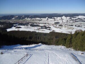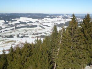 Dann geht es, überwiegend im Wald, etwa 1 km immer auf der Höhe nach Westen zum 20 m hohen Aussichtsturm, dem Alpkönigsblick. Eigentlich wäre ein solcher Turm gar nicht erforderlich – man hat da auch ohnehin eine prachtvolle Aussicht. Nur im Westen verdeckt die nahe gelegene Waldspitze den Blick zum Bodensee und der Schweizer Säntis-Berggruppe. etwa 200 m weiter westlich auf dem Grat steht das Gipfelkreuz. Von dort könnte man etwa 1 Std. immer weiter auf gleicher Höhe den Grat nach Westen wandern, zum Bockerstein und Räuberhöhle. Hier tritt eindrucksvoll das Nagelfluhgestein zu Tage, aus dem der Hauchenberg besteht. Und von dort geht es nach allen Seiten steil bergab nach Missen, Wilhams oder Weitnau.