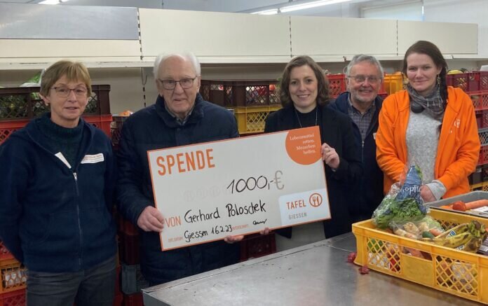 Gerhard Poloschek, ehemaliges Vorstandsmitglied und Vorstandsvorsitzender der Sparkasse Gießen, feierte kürzlich seinen 90. Geburtstag. Anstatt Geschenken bat er seine Gratulanten und Gäste um Spenden an die Tafel Gießen. Poloschek rundete die Spendensumme auf 1.000 Euro auf und übergab den Spendenscheck an Tafel-Leiterin Anna Conrad. Diese freute sich über die finanzielle Unterstützung für die Tafel und dankte dem Jubilar für sein Engagement.