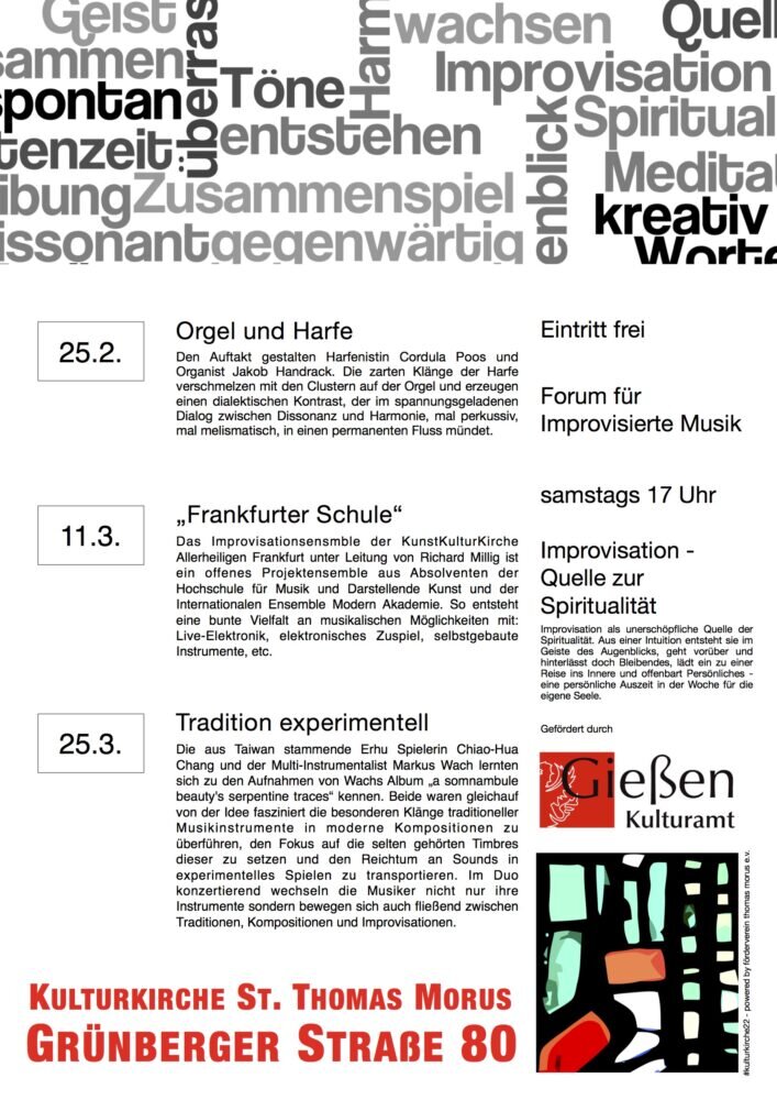 Der Eintritt ist frei, unterstützt durch das Kulturamt der Stadt Gießen. Mehr Informationen unter www.kulturkirche-giessen.de