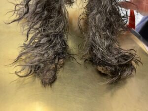 Wir meldeten uns bei der angegebenen Telefonnummer. Es war der Sohn des Eigentümers. Sein Vater sei dement und er bat uns, Darko und Kerry zur Pflege bei uns aufzunehmen. Auf den Zustand der Hunde angesprochen, fand er diesen nicht so schlimm.