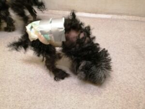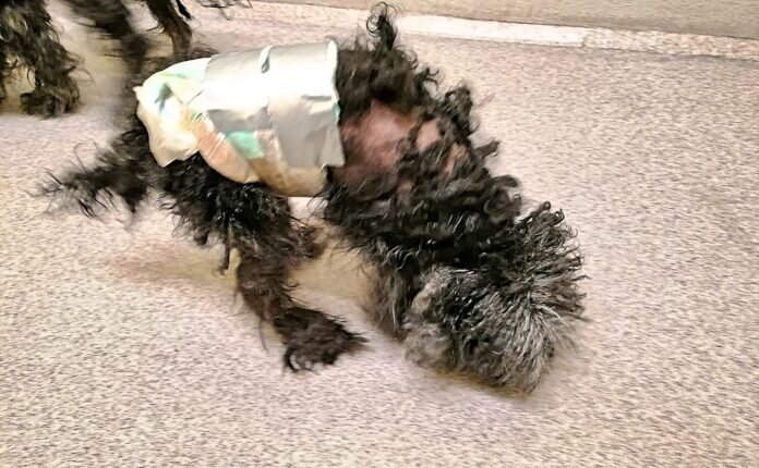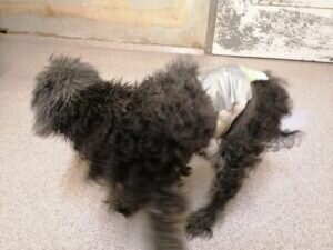 Lichtes Fell und Windeln, die ihnen mit Gaffa Tape um den Körper gebunden waren – das ganze Fundtierhaus stank. Anbei befand sich eine Nachricht der Polizei, bei wem wir uns melden sollten wegen der beiden Hunde.