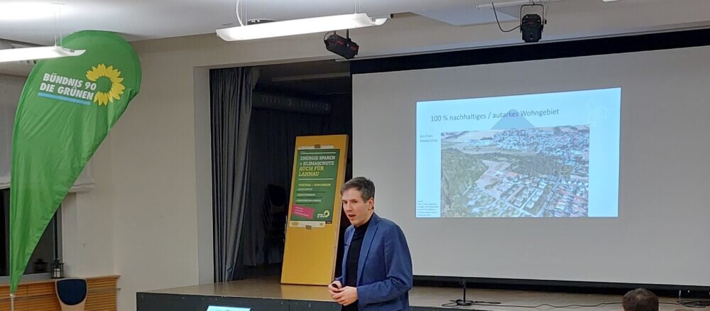 Bürgermeisterkandidat Christian Walendsius der dritte Redner des Abends stellte diesen Punkt vor und präsentierte darüber hinaus eigene weitere Ideen, wie z.B. eine Nahwärmeversorgung für Lahnau, da einige Häuser im Altbestand für Wärmepumpen nicht geeignet sind. Auch die Rückgewinnung der Wärme des Abwassers ist ein weiterer Vorschlag.