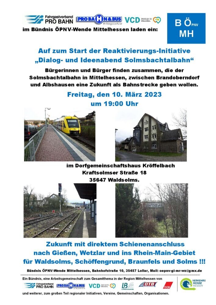Die Diskussion um einen möglichen Wiederaufbau der Solmsbachtalbahn ist derzeit auch in den Kreistagen des Hochtaunuskreises und des Lahn-Dill-Kreises ein aktuelles Thema. Das Bündnis ÖPNV-Wende Mittelhessen will Menschen zusammenbringen, die sich darüber hinaus für die Solmsbachtalbahn engagieren möchten oder sich einfach nur für das Thema interessieren.