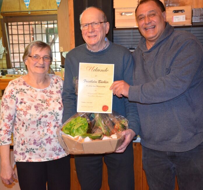 Geehrt wurden für 30jährige Mitgliedschaft Walter Stumpf und Albrecht Kreiker, für 40 jährige Mitgliedschaft Roland Müller und Friedhelm Büchler. Die drei erstgenannten fehlten wegen Erkrankung und ihnen werden die Urkunden und Präsente nachgereicht. Friedhelm Büchler gratulierte der Kreisvorsitzende Reza Veissi zusammen mit der Vorsitzenden Elvira Schäfer und überreichten als Dankeschön einen Präsentkorb.