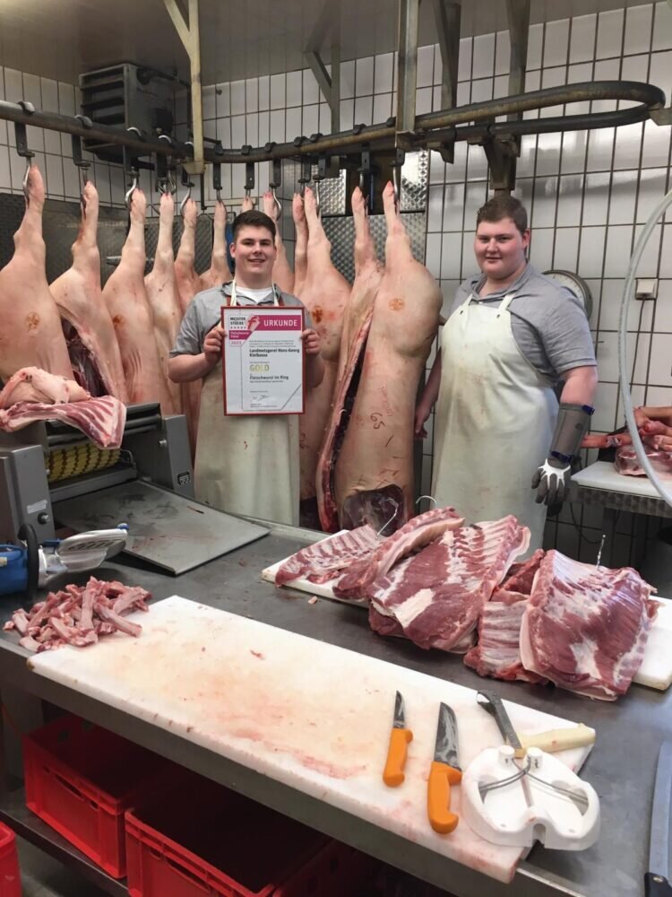 Eine neuerliche Auszeichnung für ihre hervorragende Qualität erfuhr kürzlich die Lardenbacher Landmetzgerei Hans-Georg Kielbassa. Beim von der Nordrhein-westfälischen Fleischerinnung durchgeführten Fleischwurstpokal wurde die von dem heimischen Metzgereiteam produzierte Fleischwurst im Ring nach ihrer Bewertung ohne Punktabzug mit Gold ausgezeichnet. Die nunmehr erfolgte Auszeichnung ist erneut ein Beweis für die nicht nur bei der Fleischwurst vorhandenen fachmännischen Fleischverarbeitung. So gab es in der Vergangenheit bereits auch Auszeichnen für weitere Wurstwaren des Lardenbacher Handwerkbetriebes. Mit dem gesamten Metzgereiteam freuen sich beim Präsentieren der Urkunde Metzgermeister Marco Adam (re) und Auszubildender Eric Bienek über das großartige Wettbewerbsergebnis.