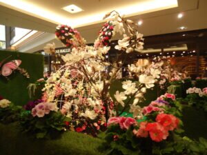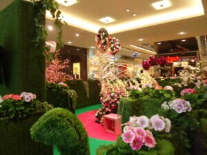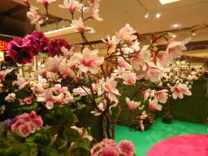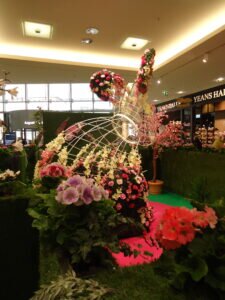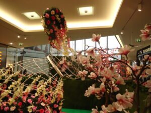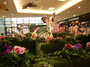 Frühling und Ostern sollen den Handel zum Erblühen bringen. Und da und dort geben sich die Konsumtempel und Einkaufszentren auch viel Mühe, die entsprechende Atmosphäre zu schaffen. Hier handelt es sich um eines der ca. 370 deutschen “Market-Places” der ECE-Group, gegründet von Versandhauspionier Werner Otto im Jahre 1965. Auch dieses hier war in  den Hochzeiten der Corona-Pandemie über lange Zeiten dunkel und die Läden geschlossen, außer der Lebensmittel-Supermarkt, die beiden Drogerien und die Apotheke. So gab es in der Pandemie Gewinner und Verlierer. Leerstände gab es in dem Zentrum auch vor Corona immer wieder mal. Auch jetzt stehen auf jeder der drei Etagen regelmäßig etwa 2 Läden leer. Der letzte Fall ist die Insolvenz der Schuhkette Reno, die gerade noch die letzten Reste aus den Regalen verscherbelt. Man kann also nicht unbedingt behaupten, daß das Konzept der Einkaufszentren zeitgemäßer und sicherer wäre, als das von Galeria-Karstadt-Kaufhof.Zumindest der Eigentümer dieses aktuellen Problemfalls, René Benko, ist bislang gut damit gefahren. Laut wikipedia schätzt Forbes sein Vermögen in 2021 auf 5,6 Mrd. Dollar. Laut dem österreichischen Wirtschaftsmagazin Trend betrug sein Vermögen im Jahre 2014, bei der Übernahme von Karstadt, noch etwa 850 Mio Euro. Die Beschäftigten verzichteten auf Tariflöhne, Urlaubs- und Weihnachtsgeld.Nichtsdestotrotz kämpfen alle Städte, große und kleine, gegen die Verödung der Innenstädte und Leerstände. Oft wird es auf die Expansion des online-Handels zurückgeführt. Vielfach wird aber auch festgestellt, dass die Vermieter die Läden und Geschäftsräume lieber leerstehen lassen, als die Mieten zu senken. Auch bei etlichen der jetzt geschlossenen Galeria-Karstadt-Häuser wird das festgestellt.Man darf gespannt sein, wie sich das alles weiter entwickelt. Auf jeden Fall haben zur Zeit viele Besucher, vor allem Familien mit Kindern, des Einkaufszentrums ihre Freude an der Dekoration, zumal jetzt auch noch ein Begleitprogramm mit Ostereierbemalen, Lämmchen backen und Kasperletheater startet.