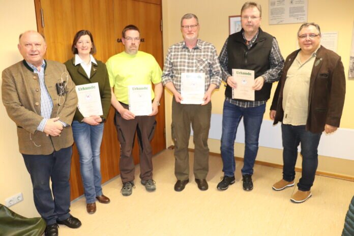 Zu Beginn der Mitgliederversammlung der Jägervereinigung Oberhessen ehrten 1. Vorsitzender Helmut Nickel und dessen Stellvertreter Werner Müssig die Mitglieder Katrin Rose (Gemünden/Felda), Thilo Berg (Lardenbach), Rainer Grundmann (Mücke) und Andreas