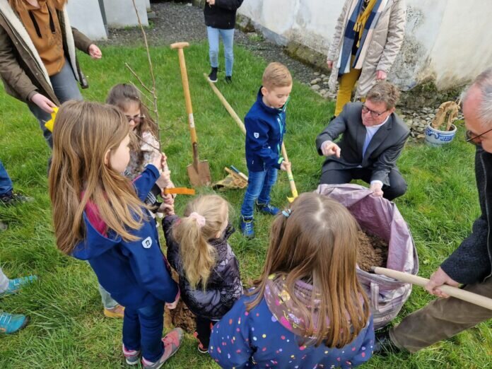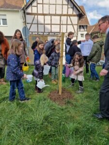 Danach ging es hinter der Kirche weiter, ein Birnbaum wurde mit Hilfe der Kinder, gepflanzt, gewässert und geschmückt. Eier, Schmetterlinge und Osterkörbchen schmücken nun den Birnbaum und wir hoffen auf ein gutes Wachstum.