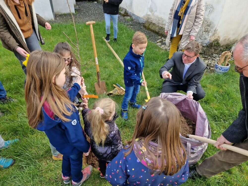 Nach der Begrüßung durch unseren Pfarrer Hans Peter Gieß sangen wir gemeinsam ein von ihm passend zur heutigen Aktion umgedichtetes Bewegungslied. Lasst uns miteinander pflanzen, gießen, schmücken den Baum…..