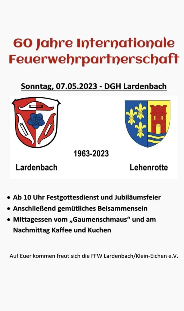 „60 Jahre – und noch immer gute Freunde“ könnte das Motto bei der in diesem Jahr anstehenden Partnerschaftsfeier für die heimische Freiwillige Feuerwehr Lardenbach/Klein-Eichen und die in Niederösterreich beheimatete Wehr Lehenrotte heißen. Die wohl in Europa älteste Feuerwehrpartnerschaft wurde 1963 durch den Lardenbacher Ehrenwehrführer Helmut Felsing und dem Feuerwehrkommandanten Josef Lampl aus Lehenrotte ins Leben gerufen und wird auch heute noch durch die Nachfolgegenerationen gepflegt. So ist es auch nur eine Selbstverständlichkeit, dass dieses Jubiläum im entsprechenden Rahmen zusammen mit etwa 30 Feuerwehrangehörigen aus der Alpenrepublik und auch gern gesehenen Besuchern aus der Region gefeiert wird. Am Sonntag, 7. Mai 2023 gibt es im Dorfgemeinschaftshaus in Lardenbach im Anschluss nach einen um 10 Uhr beginnenden Festgottesdienst in Anwesenheit von Ehrengästen aus Deutschland und Österreich einen kleinen Festakt. Im weiteren Veranstaltungsverlauf steht dann die Partnerschaftspflege bei einem gemütlichen Beisammensein im Vordergrund. Zur Mittagszeit können sich die Festgäste an einem Essen vom „Gaumenschmaus“ stärken. Am Nachmittag wartet dann bei Kaffee noch „Selbstgebackenes“ auf alle Kuchenliebhaber.