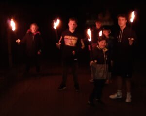 Das Radballtraining wurde – der Monotonie trotzend – immer wieder, durch alternative Spiele oder Sportarten (z.B. Fußball oder Handball) unterbrochen. Auch genügend Pausen waren anberaumt worden. Zum gemeinsamen Abendessen gab es Pizza für alle. Nach einer anschließend letzten Trainingssequenz für diesen Tag, wurde eine Nachtwanderung in Form eines Fackelzuges rund um den Gleiberg mit Begeisterung unternommen. Zurück in der Sporthalle musste aber zunächst gemeinsam ein Matratzenlager errichtet werden, bevor alle ziemlich geschafft in ihre Schlafsäcke kriechen konnten.