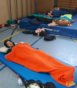 Das Radballtraining wurde – der Monotonie trotzend – immer wieder, durch alternative Spiele oder Sportarten (z.B. Fußball oder Handball) unterbrochen. Auch genügend Pausen waren anberaumt worden. Zum gemeinsamen Abendessen gab es Pizza für alle. Nach einer anschließend letzten Trainingssequenz für diesen Tag, wurde eine Nachtwanderung in Form eines Fackelzuges rund um den Gleiberg mit Begeisterung unternommen. Zurück in der Sporthalle musste aber zunächst gemeinsam ein Matratzenlager errichtet werden, bevor alle ziemlich geschafft in ihre Schlafsäcke kriechen konnten.