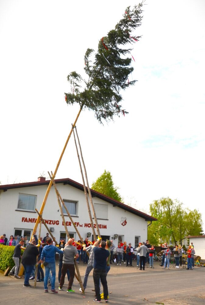 Pohlheim – Mit dem Aufstellen des Maibaumes unter den Klängen des Musikzuges der Freiwilligen Feuerwehr Holzheim e.V. begann um die Mittagszeit des 1. Mai die Maifeier auf dem Gelände des Holzheimer Musikzugs.