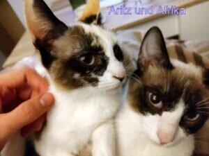 Aritz, Kater und Àfrica, Katzenädchen, sind ca. ein Jahr. Die Geschwister sind “Kuschelmonster”! Sie hängen sehr aneinander und eine getrennte Vermittlung kommt nicht in Frage. Die Katzen werden viel Freude und Abwechslung für ihre neue Familie im Gepäck haben und mit ausgelassenen Spielen Abwechslung ins Haus bringen.