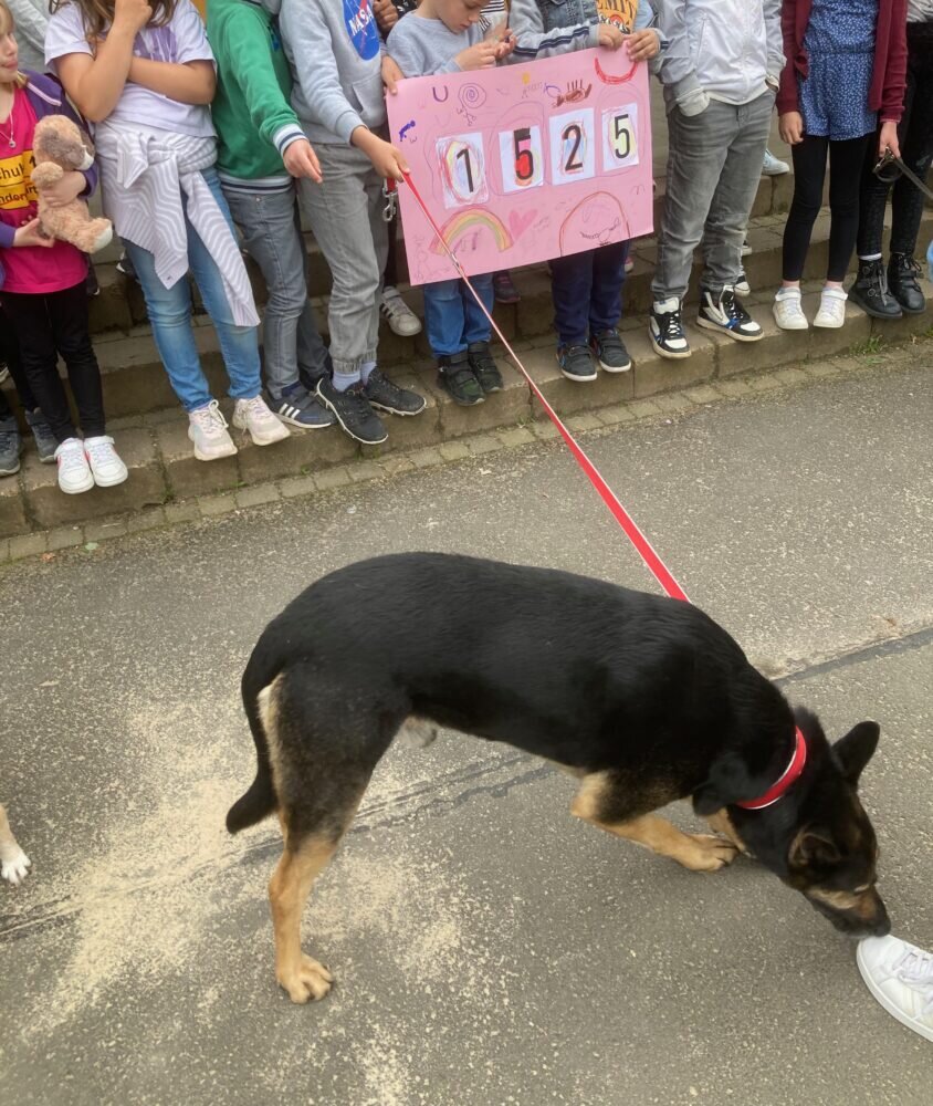 Wofür? Die Kinder hatten sich im Schülerrat, unterstützt von Schulleiterin Nina Schäfer und Pädagogin Anika Hänsgen dafür ausgesprochen, das Geld vom Sponsorenlauf an das Tierheim zu spenden. Als sie diesen Vorschlag in den Klassen vorstellten, waren viele sofort begeistert: für so einen guten Zweck wollten sie gerne laufen. Angefeuert von den Lehrkräften und einigen Eltern drehten die Mädchen und Jungen dann vor den Osterferien tapfer ihre Runden und sammelten Stempel auf ihren Laufkarten. Einige errechneten beim Laufen sogar schon den Erlös und wurden dadurch noch zusätzlich angespornt. Auch zwei Mitarbeiterinnen vom Tierheim waren an diesem Tag vor Ort. Nach den Ferien wurden dann die Gelder eingesammelt und als die 1000€-Marke geknackt wurde gab es schon den ersten Jubel. Für so eine kleine Schule ist die Summe beachtlich und so freute sich auch Astrid Paparone, als sie von der Schule zur Spendenübergabe eingeladen wurde und von der hohen Spendensumme erfuhr. Begleitet von drei ehemaligen Tierheim-Hunden nahm sie die Spenden im Beisein der Schülerinnen und Schüler der Klassen 1 und 2 sowie einigen Lehrkräften entgegen. Die Vorsitzende des Tierschutzvereins bedankte sich herzlich und freute sich besonders über das Engagement junger Menschen, denn sie sind unsere Zukunft. Es ist schön, wenn die Kinder schon im jungen Alter Tiere als Mitgeschöpfe wahrnehmen und das Bedürfnis haben, Ihnen zu helfen. Im Sommer plant die Schulgemeinde im Rahmen einer Wanderung einen Besuch beim Tierheim.