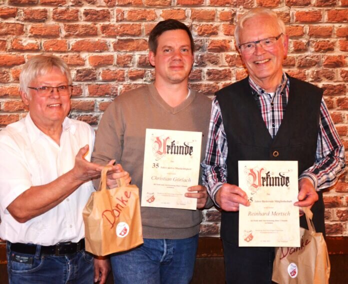 Geehrt mit Urkunde und Geschenk wurden drei Mitglieder für 65jährige Mitgliedschaft: Reinhard Mertsch, Gerhard Wenzel und Ottmar Jäger. Christian Görlach wurde für 35 Jahre als aktiver Musiker und Gerald Dörr für 10 Jahre aktiver Musiker mit Urkunden und kleinem Geschenk vom Vorsitzenden Seidler gedankt.