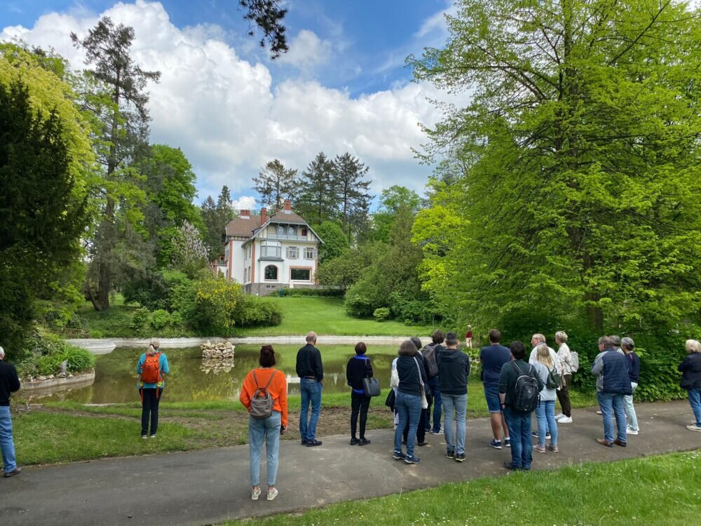 Während des geführten Spaziergangs durch den Gail’schen Park konnte die Gruppe die für das Paar wichtigen Orte besuchen: das Schweizer Haus, wo Wilhelm und Minna eine Zeit lang gewohnt haben; den Uhrenturm mit dem wunderschönen Blick auf den gegenüberliegenden Teich mit dem Eishaus direkt am Wasser und der Villa; das Spielhaus mit den damaligen Spielgeräten draußen, wo die Kinder aus der zweiten Ehe Wilhelms spielten. Bei der Führung wurden auch historische Fotos gezeigt, um Personen und Alltag sich besser vorzustellen.