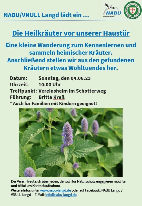 NABU/VNULL Langd laden zu einer kleinen Wanderung ein. Ziel dabei ist das Kennenlernen und Sammeln heimischer Kräuter. Anschließend soll aus den gesammelten Kräutern etwas Wohltuendes hergestellt werden.