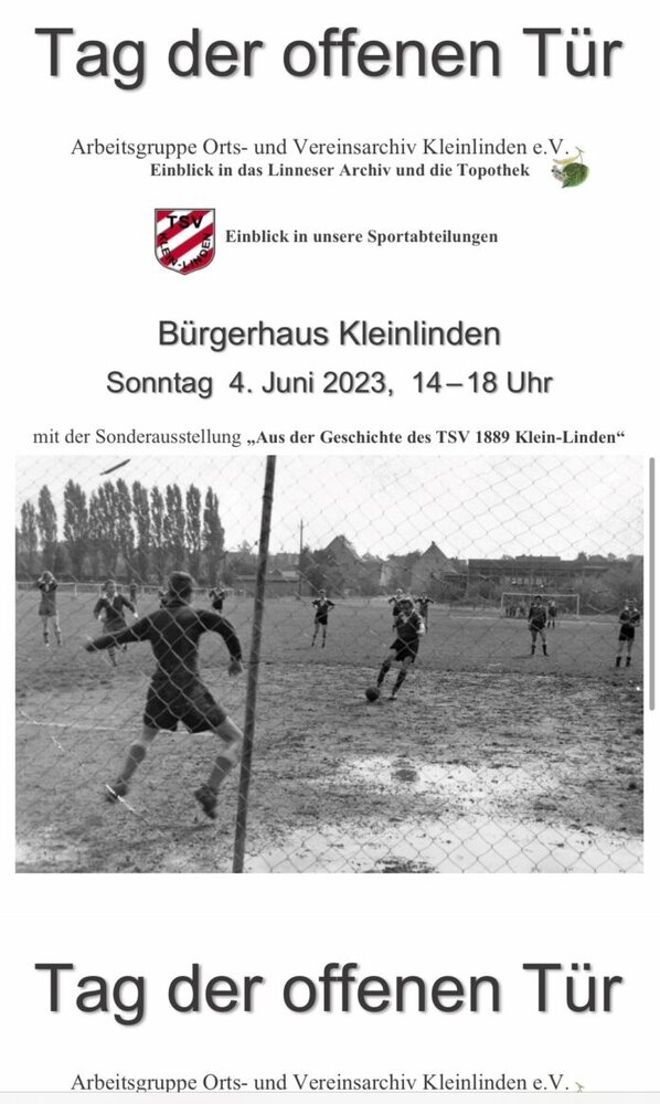 Arbeitsgruppe Orts- und Vereinsarchiv Kleinlinden e.V. und TSV 1889 Klein-Linden laden ein zum Tag der offenen Tür am 4. Juni 2023 ins Kleinlindener Bürgerhaus ein mit der Sonderausstellung „Aus der Geschichte des TSV 1889 Klein-Linden“.