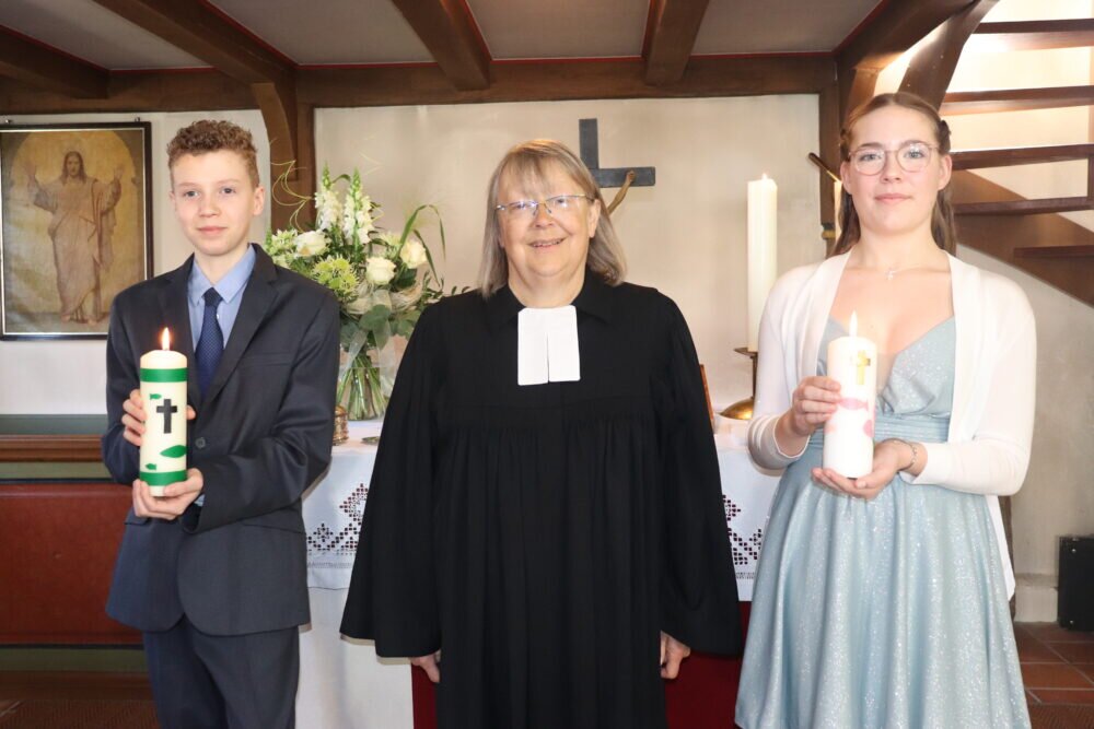 In einem von Pfarrerin Cordula Michaelsen gestalteten feierlichen Abendmahlgottesdienst wurden die diesjährige Konfirmandin Emma Berg (Klein-Eichen) mit dem Konfirmandenspruch „Sprüche 16, Vers 9“, und der Konfirmand Luca Zimmer (Lardenbach) mit dem Bibelspruch „Kolosser 3, Vers 23“ eingesegnet. Im Namen des Kirchenvorstandes der Kirchengemeinde Lardenbach/Klein-Eichen begrüßte Heike Hofmann die Konfirmanden als neue nunmehr eigenverantwortliche Kirchenglieder. Wie auch Pfarrerin Michaelsen wünschte sie den beiden jungen Christen für die Zukunft stets einen festen Glauben an Gott.