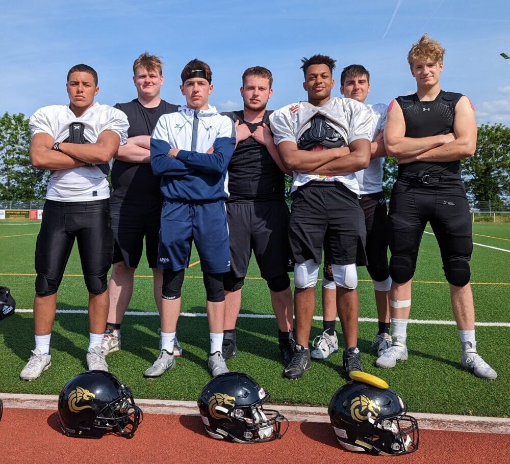 Am Pfingstmontag fand in Wölfersheim ein HessenPride-Trainingstag im Rahmen der Leistungssportförderung statt, zu dem auch Spieler der Giessen Golden Dragons der Einladung gefolgt waren (von links nach rechts): Darnell Reinhardt (Running Back), Linus Pünsch (O-Liner), Clemens Hospes (Quarterback), Niklas Pfeiffer (Linebacker), Yaffily Trawalley (Wide Receiver), Benedikt Witteck (Wide Receiver) und Lutz Hauptvogel (Tight End).