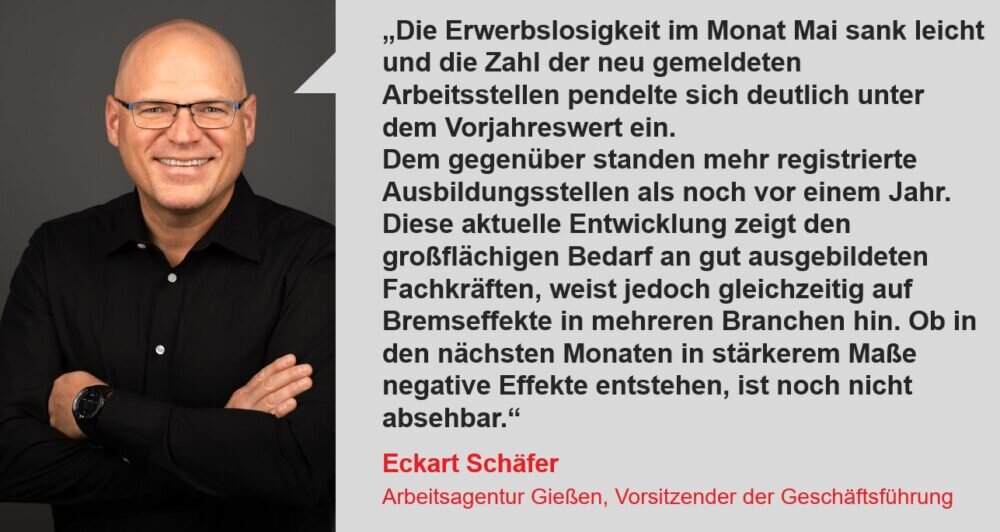 „Die Erwerbslosigkeit im Monat Mai sank leicht und die Zahl der neu gemeldeten Arbeitsstellen pendelte sich deutlich unter dem Vorjahreswert ein“, kommentiert Eckart Schäfer, Leiter der Arbeitsagentur Gießen. „Dem gegenüber standen mehr registrierte Ausbildungsstellen als noch vor einem Jahr. Diese aktuelle Entwicklung zeigt den großflächigen Bedarf an gut ausgebildeten Fachkräften, weist jedoch gleichzeitig auf Bremseffekte in mehreren Branchen hin. Ob in den nächsten Monaten in stärkerem Maße negative Effekte entstehen, ist noch nicht absehbar.“