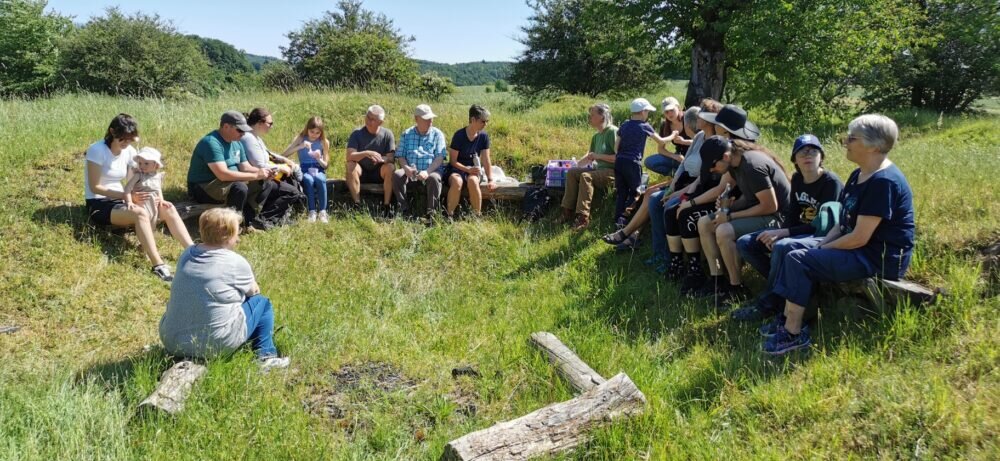 Foto: Beate Pötsch mit der Gruppe der Teilnehmer auf dem Köppel bei Erläuterung der